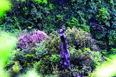 心子岩因两翼山脊延伸处形如“心”字而得名。心子岩两侧山岩灌木较少,裸露的山岩经雨水千百年的冲刷形成天