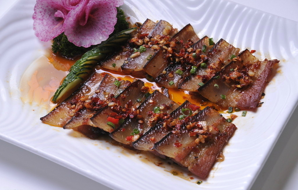 腊肉是苗家人的待客珍品,每年临近年关熏制。熏制时先将猪肉切成三至五斤一块,揉盐和各种香料后腌三至五天,待盐及香料浸进肉内,再用竹条或藤条穿串挂到火炕上,以烟火慢慢熏干。熏制得比较好的腊肉一般可保存半年以上。如用桔子皮熏烘,腊肉油中透红,红中透亮,不见烟灰,颜色更显好看。腊肉做菜前须洗净,煮熟、蒸软、再切片,既可直接蘸酸汤辣子食用,也可加佐料翻炒,香味独特,菜色亦佳。