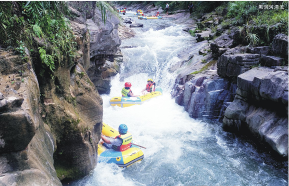 黑洞河位于秀山县龙池镇境内,比邻涌洞乡川河盖风景区,地处于川河盖风景区规划范围内,拟试漂起点黑洞口,终点小坝村,全长7.5公里。沿途穿过黑洞和川洞两个天然溶洞,两岸沿线有千仞绝壁、跑马悬影等绝美风光,飞瀑直下、小桥流水等迷人美景;古柏苍松、游鱼潜底的自然情趣更是令人一路心旷神怡、神清气爽;急流飞瀑、直飘而下的惬意顿时让人神游于仙境、往返于太空